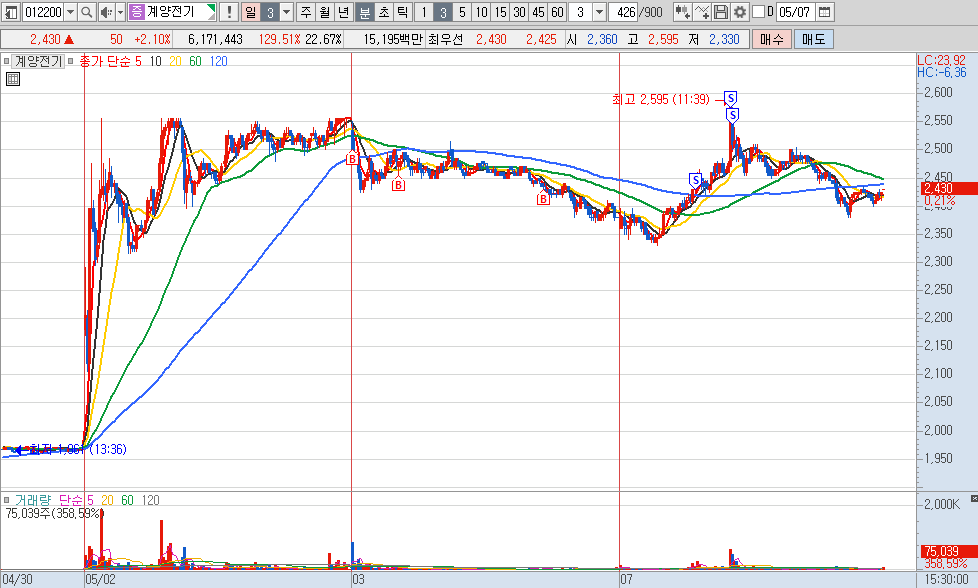 계양전기 (시총 660억 / 유통비율 54% / 거래대금 500억)